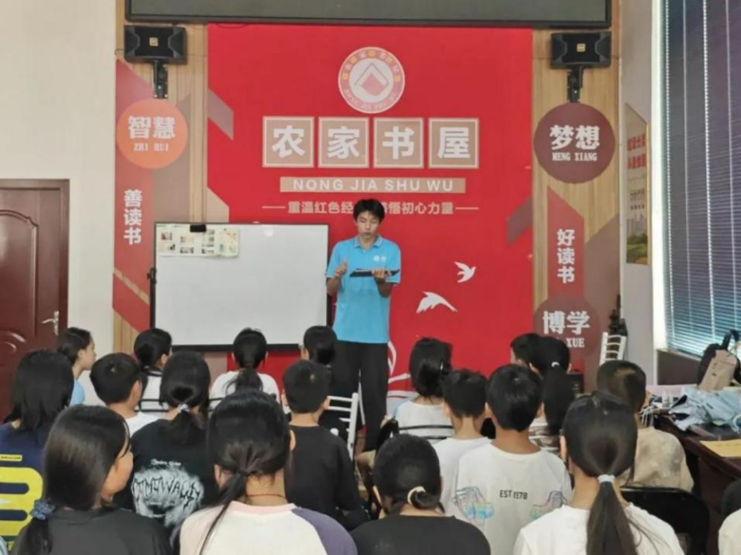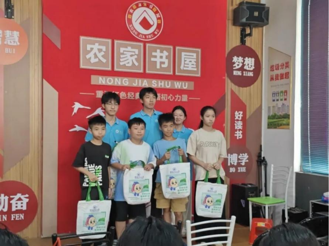 第四站,团队联动广西大学青年志愿者协会,赴来宾象州百丈乡,以“乡村环保科普”为核心开展活动。在百丈乡农家书屋,队员们打造了一场“微塑料科普小课堂”:先用卡通图片讲解“什么是微塑料”“微塑料如何进入我们的生活”,再结合日常场景分享“减少微塑料污染的小技巧”(如少用一次性塑料制品等);随后开展知识竞答,让小朋友在互动中巩固知识。这场科普活动不仅让孩子们掌握了环保常识,更在他们心中播下生态保护的种子,也为乡村科普提供了“趣味化、生活化”的可借鉴模式。